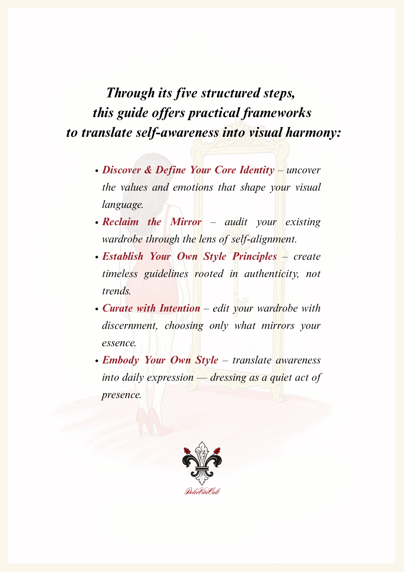 Each chapter combines reflection, practical exercises, and cultural insight — blending psychology, philosophy, and aesthetics into a timeless manual for self-authorship through style.